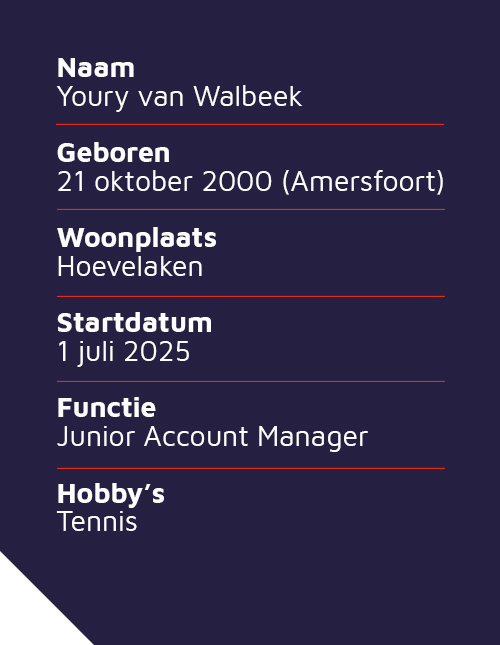 Waarom werken voor EAL zo leuk is? Voor de rubriek ‘Mens achter de techniek’ leggen we elke maand vijf vragen voor aan één van onze bevlogen medewerkers om daar antwoord op te krijgen. Zo krijg je een mooi inkijkje in ons bedrijf. Dit keer stellen we ze aan Youry van Walbeek, Junior Account Manager bij EAL.